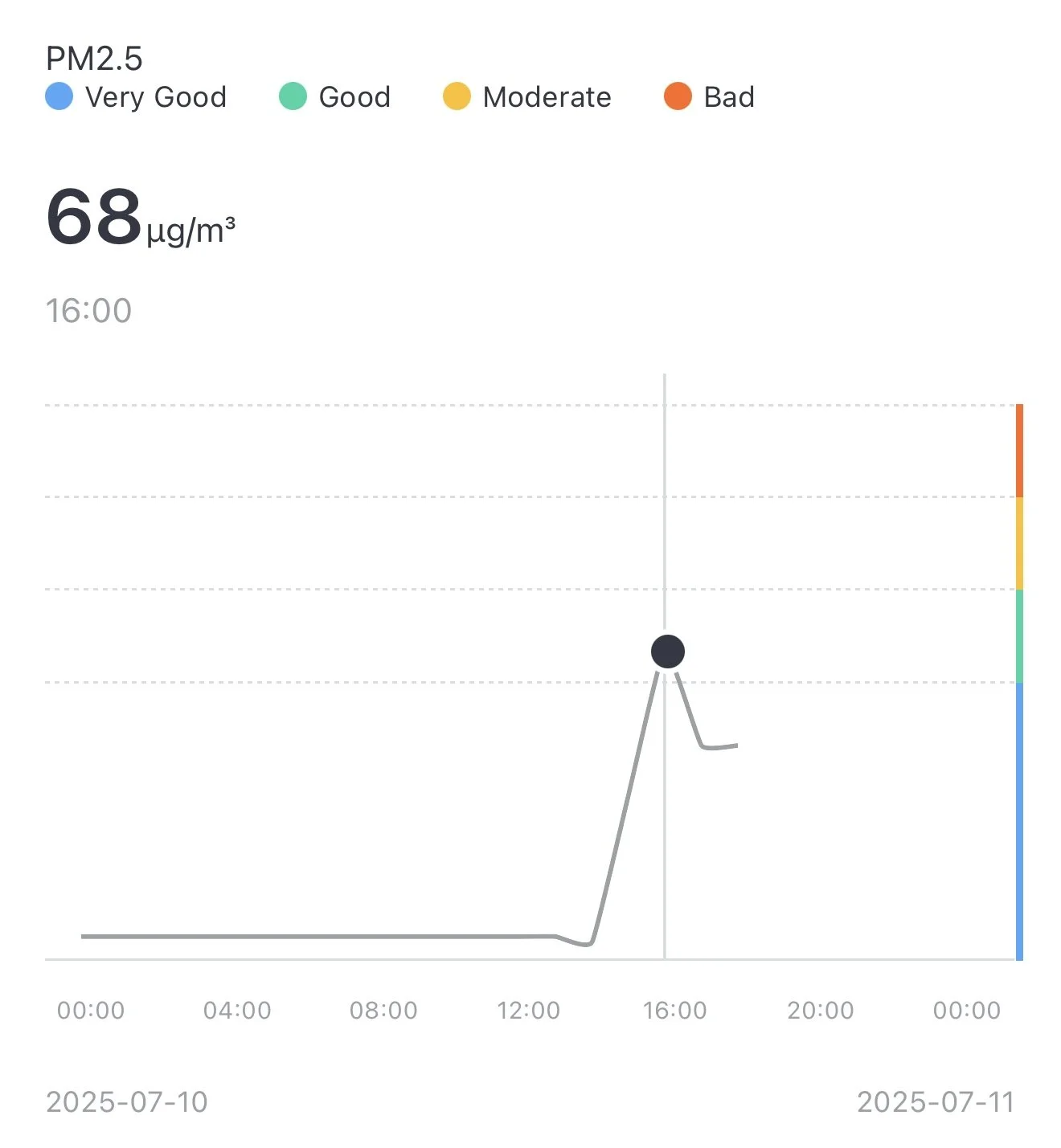 • Picked up a sharp spike to 68 µg/m³, firmly in the “Bad” range.